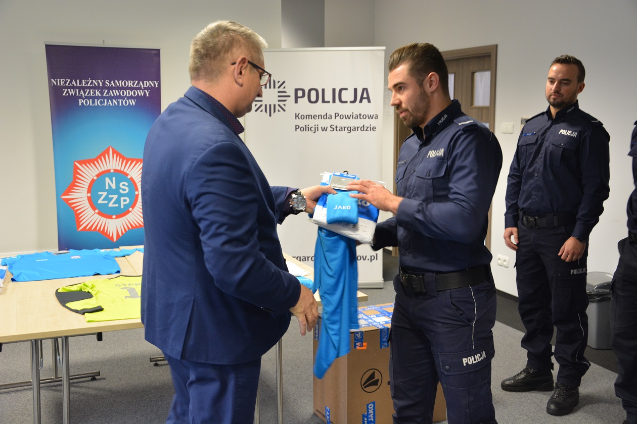 Zestaw sportowy w obecności Komendanta Powiatowego Policji w Stargardzie insp. Roberta Nowaka oraz Przewodniczącego Zarządu Terenowego Jana Podolaka przekazany został na ręce funkcjonariuszy, którzy reprezentują drużynę piłkarską KPP Stargard.