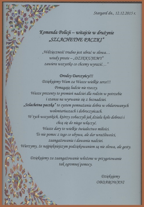 W tym roku Komenda Powiatowa Policji w Stargardzie Szczecińskim do udziału w tym projekcie zgłosiła się po raz pierwszy, ale zaangażowanie zarówno funkcjonariuszy jak i pracowników było ogromne. Do grona przedstawicieli komendy policji przyłączyli się również darczyńcy z Zakładu Karnego w Stargardzie Szczecińskim, Błękitni Stargard, a także prywatne osoby, które niepozostały obojętne na podjętą inicjatywę.