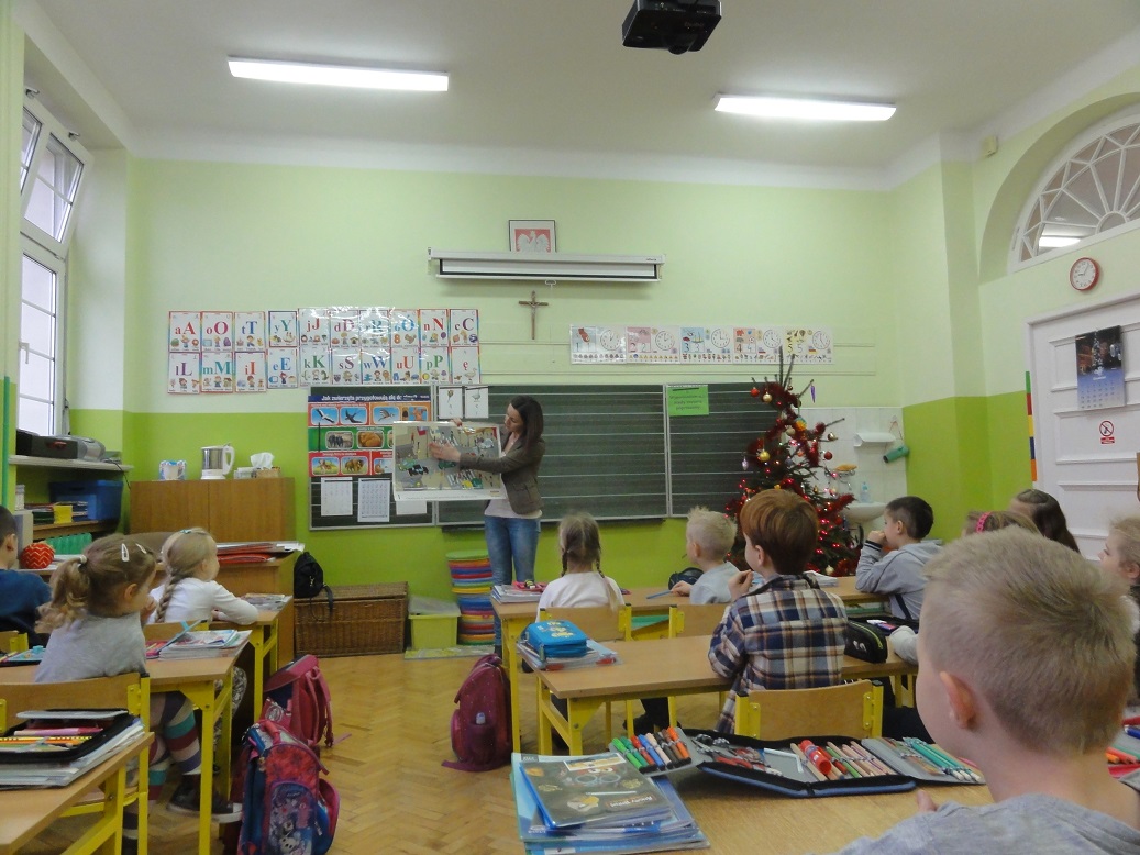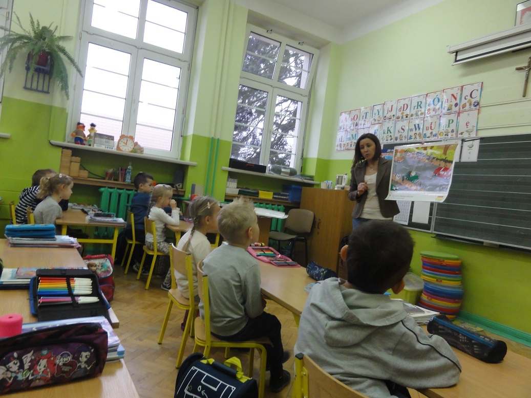 Pani Alma Selwesiuk z Zespołu ds. Nieletnich zajmując się profilaktyką dzieci i młodzieży z najmłodszymi rozmawiała o elementarnych zasadach, jakie obowiązują na drodze i w jej pobliżu. Omówiona została również tematyka dotycząca bezpiecznej zabawy zarówno w domu jak i na podwórku.