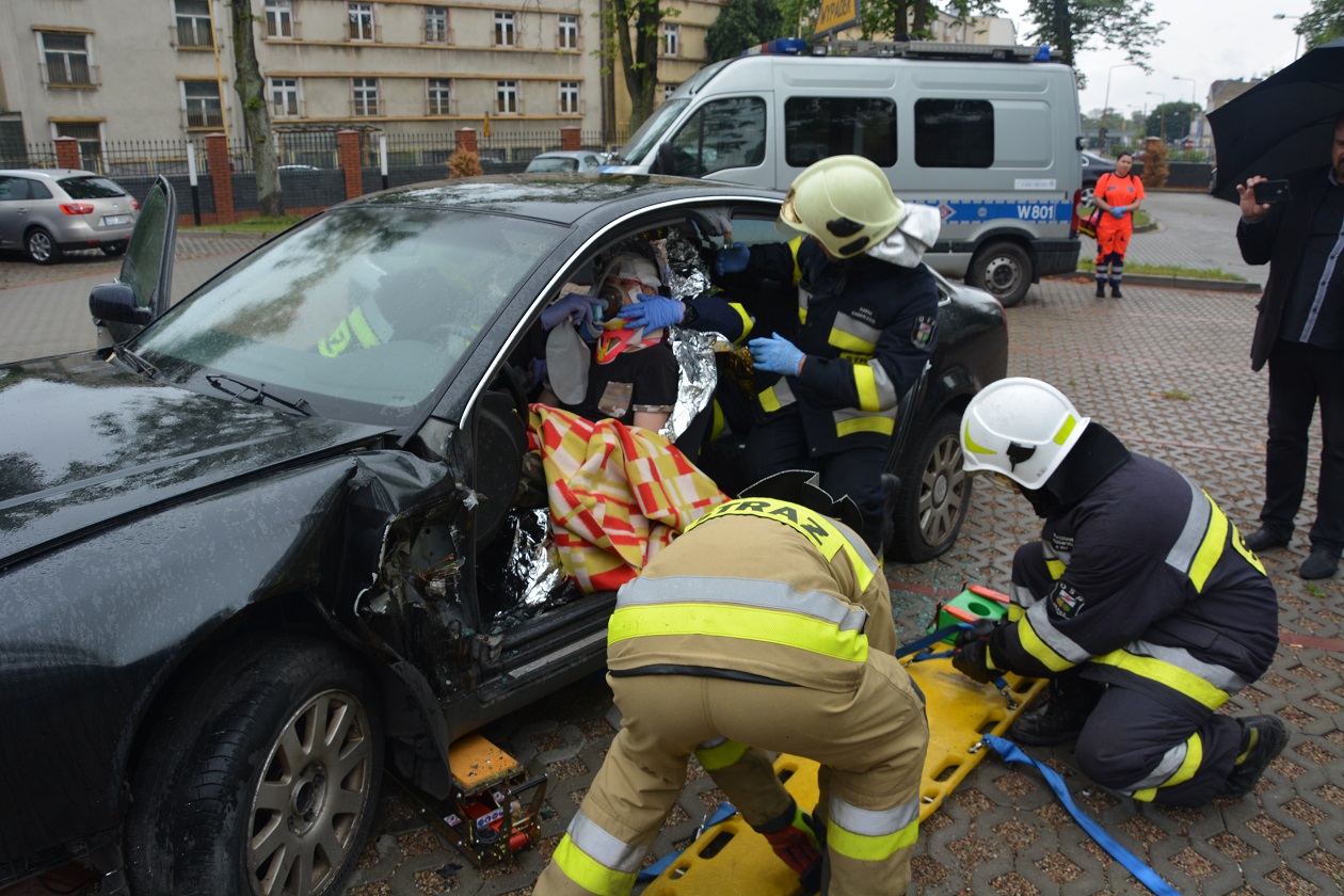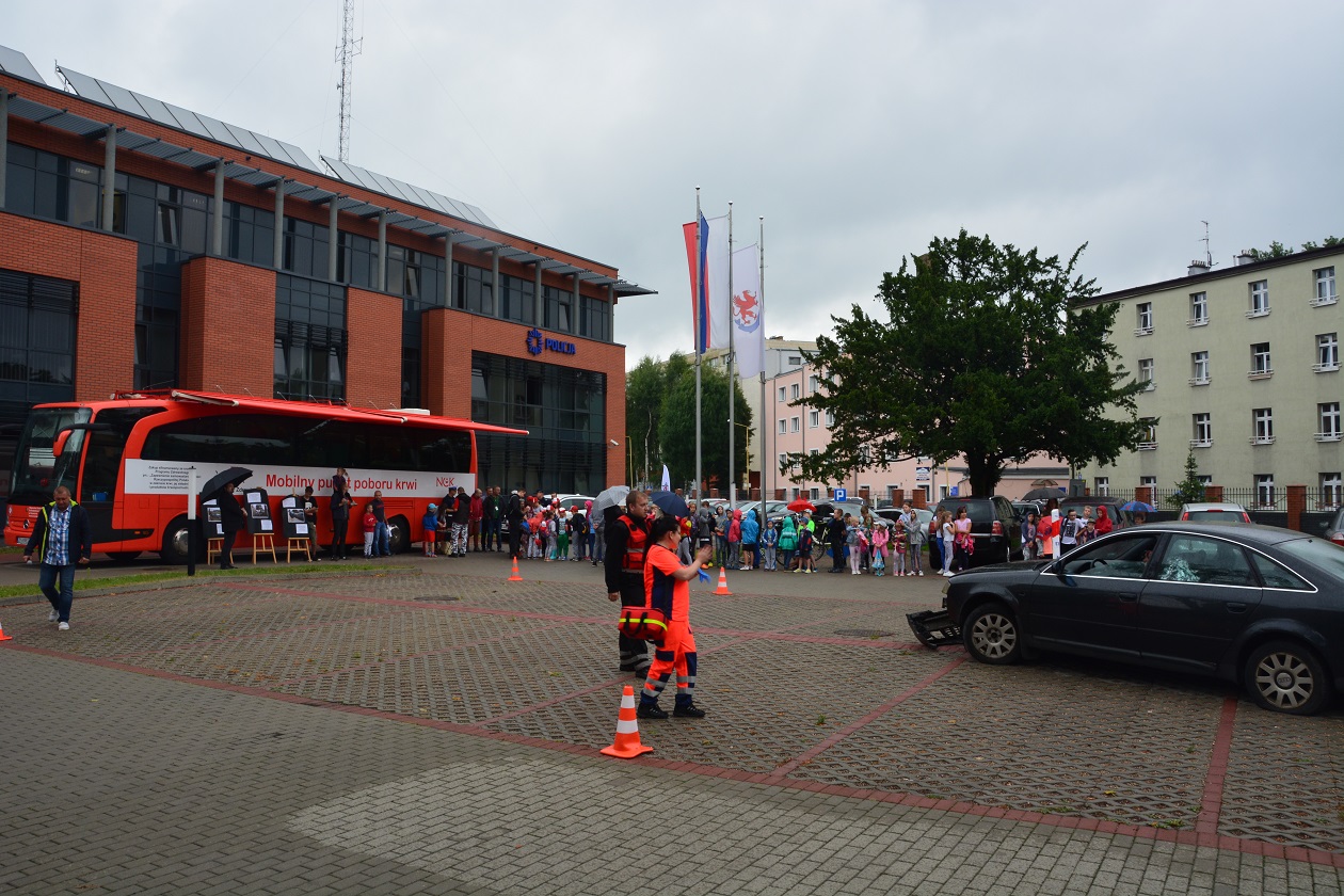Podczas dzisiejszej zbiórki krwi wszyscy którzy przybyli na teren komendy zobaczyć mogli na własne oczy pokaz ratownictwa, który zaprezentowały służby odpowiedzialne za bezpieczeństwo. Podczas działań przedstawiono scenkę wypadku drogowego w którym kierujący samochodem osobowym z niewyjaśnionych przyczyn zjechał na pobocze i uderzył w przydrożne drzewo.