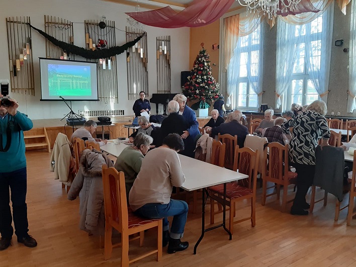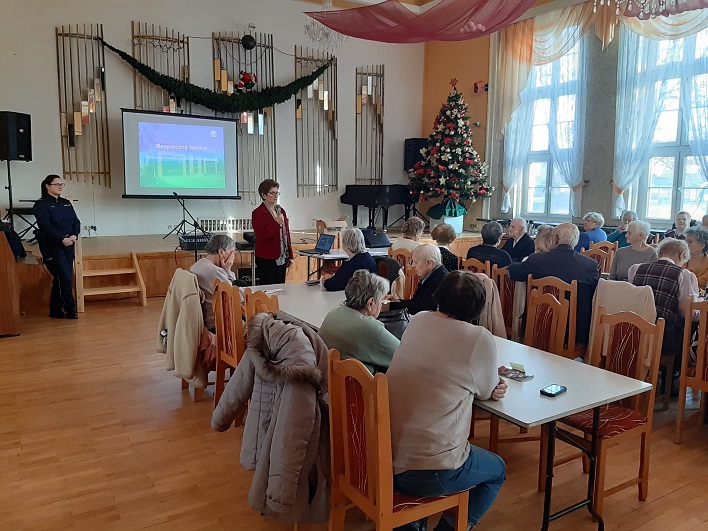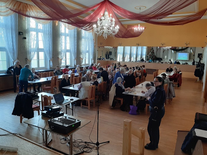Podczas dzisiejszego spotkania w sali Domu Kultury Kolejarza rozmawialiśmy o zagrożeniach jakie napotkać mogą osoby starsze w dzisiejszym świecie. Oprócz rozmów o bezpieczeństwie niechronionych uczestników ruchu drogowego, aktualnych przepisach dotyczących między innymi obowiązku i sposobu noszenia elementów odblaskowych nie zabrakło tematów związanych z oszustwami osób starszych metodami „na wnuczka, policjanta, szklankę wody”. Uświadamialiśmy wszystkich będących na spotkaniu za pomocą wyświetlanych filmów o sposobach działania oszustów, a także prawidłowego reagowania na tego typu przypadki.
