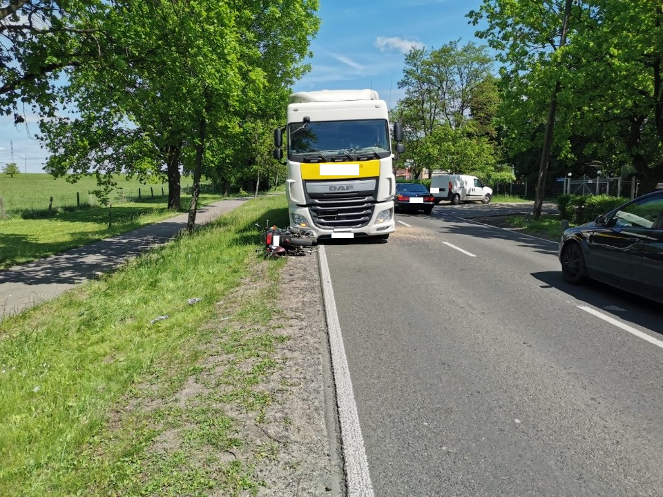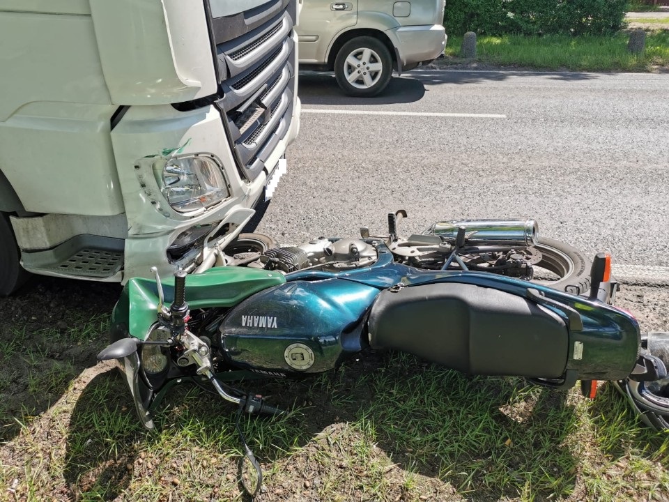 Wczoraj około godziny 12.00 na ul. Gdyńskiej w Stargardzie doszło do zdarzenia drogowego z udziałem motocykla oraz samochodu ciężarowego. Według wstępnych ustaleń 68- letni kierujący motocyklem marki Yamaha wyprzedzając samochód osobowy marki Opel nie zachował bezpiecznej odległości od poprzedzającego pojazdu w wyniku czego otarł się o jego bok co spowodowało utratę panowania nad motocyklem i doprowadziło do czołowego zderzenia z nadjeżdżającym samochodem ciężarowym marki DAF kierowanego przez 63- letniego mężczyznę.