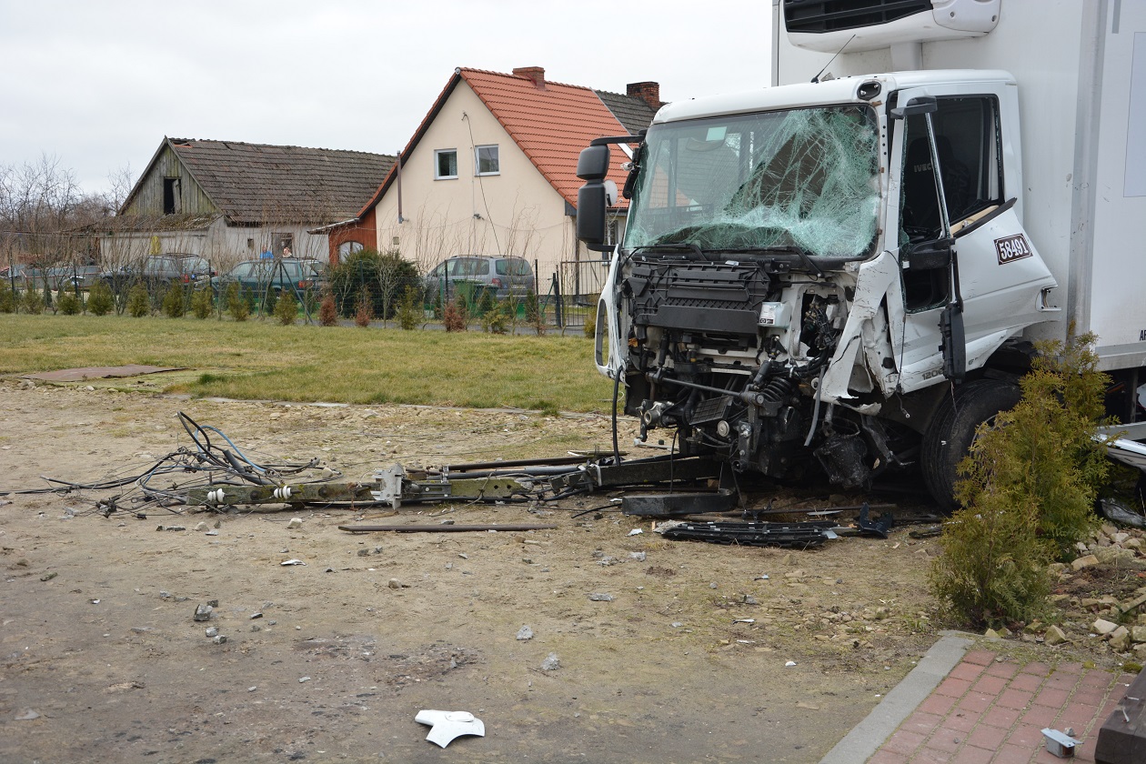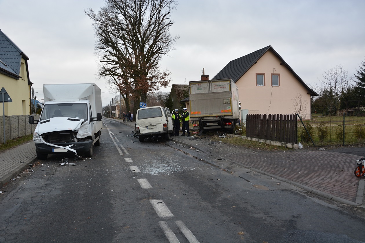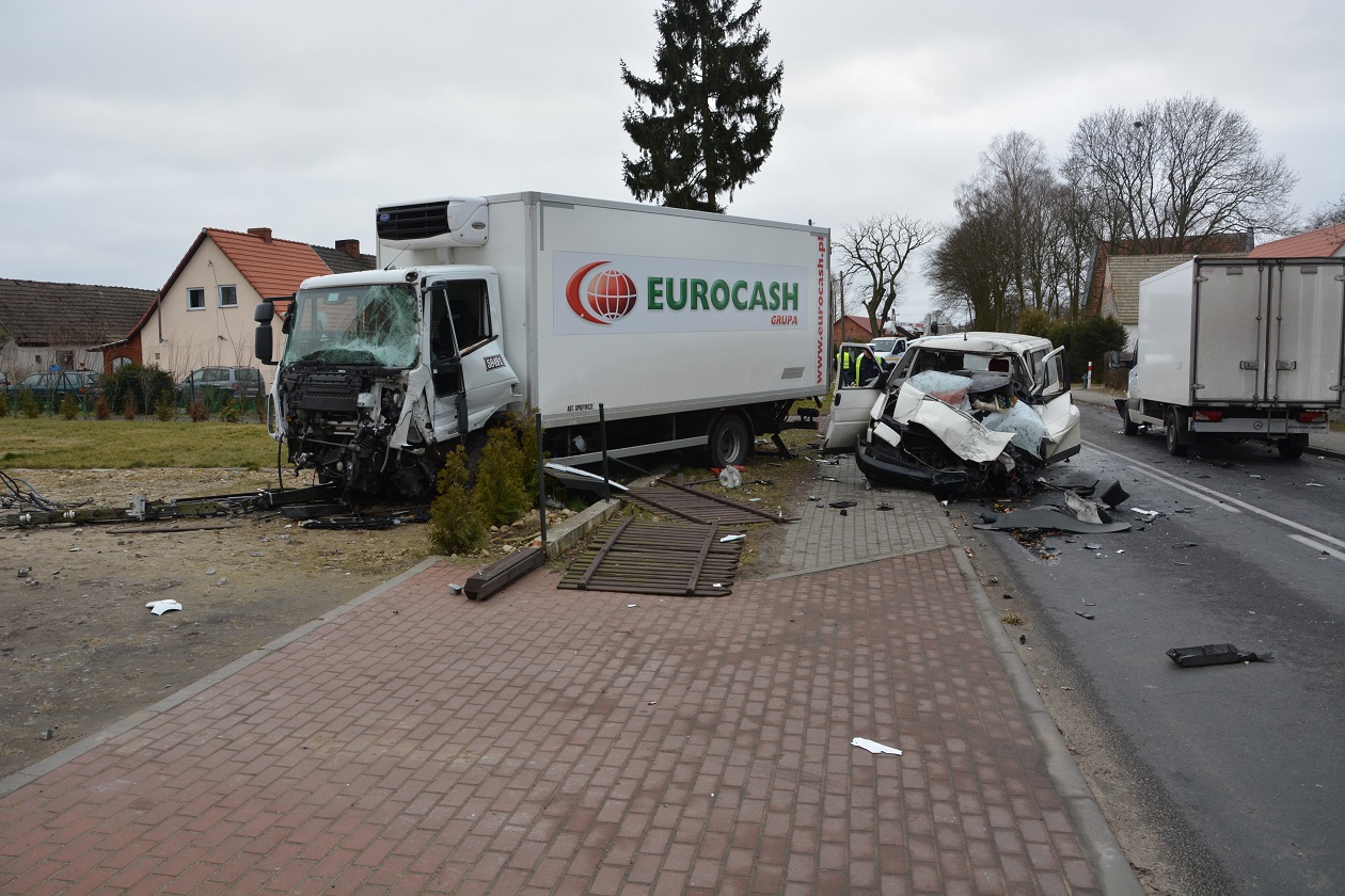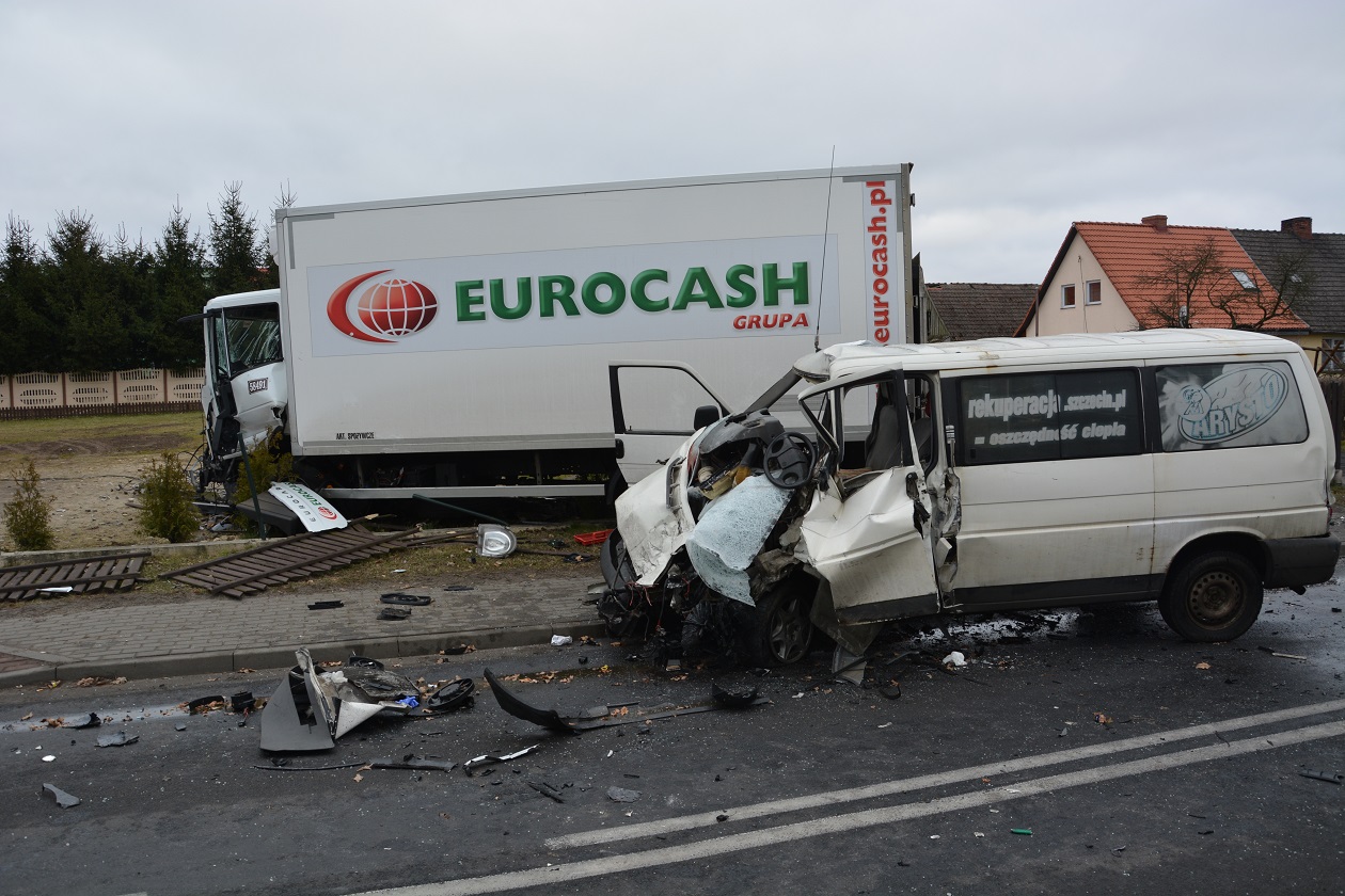 Dzisiaj około godziny 7.00 w Parlinie na drodze wojewódzkiej nr 106 24-letni kierowca VW Transportera omijał stojącego na jezdni dostawczego sprintera, którego 45-letni kierowca najprawdopodobniej zamierzał skręcić w lewo. Kierowca busa wykonując manewr wjechał na przeciwległy pas ruchu, gdzie od Stargardu prawidłowo poruszał się ciężarowy Iveco. 53-letni kierowca ciężarówki usiłując nie dopuścić do „czołówki” uciekał jeszcze na swoje prawe pobocze, ale na uniknięcie zderzenia niestety było już zbyt późno. Wskutek uderzenia uszkodzeniu uległ również stojący na jezdni mercedes, a Iveco wjeżdżając na pobocze zniszczyło ogrodzenie posesji i wjechało w słup energetyczny, z którego zerwane linie napowietrzne uszkodziły zaparkowanego na posesji opla zafirę.