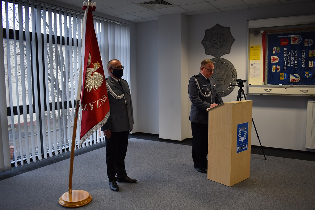 Szef stargardzkich policjantów pogratulował nowym funkcjonariuszom wyboru drogi życiowej i wstąpienia w szeregi policyjnej formacji. Podkreślił, że zobowiązali się oni strzec bezpieczeństwa, służyć obywatelom, a codzienną służbę powinni pełnić godnie i traktować ją z najwyższą powagą.