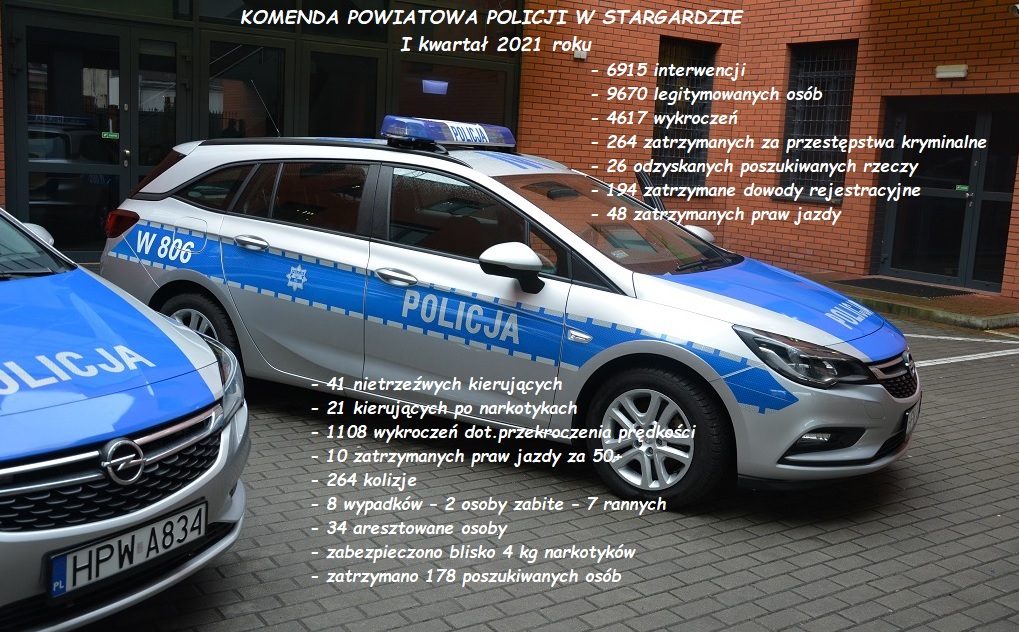 W pierwszym kwartale 2021 roku stargardzcy mundurowi przeprowadzili łącznie 6915 interwencji legitymując 9670 osób. Ujawnionych zostało 4617 wykroczeń. Funkcjonariusze zatrzymali także 264 osoby za przestępstwa kryminalne, w tym między innymi podejrzanych o dokonanie kradzieży z włamaniem oraz przestępstw narkotykowych. Odzyskali 26 poszukiwanych rzeczy.