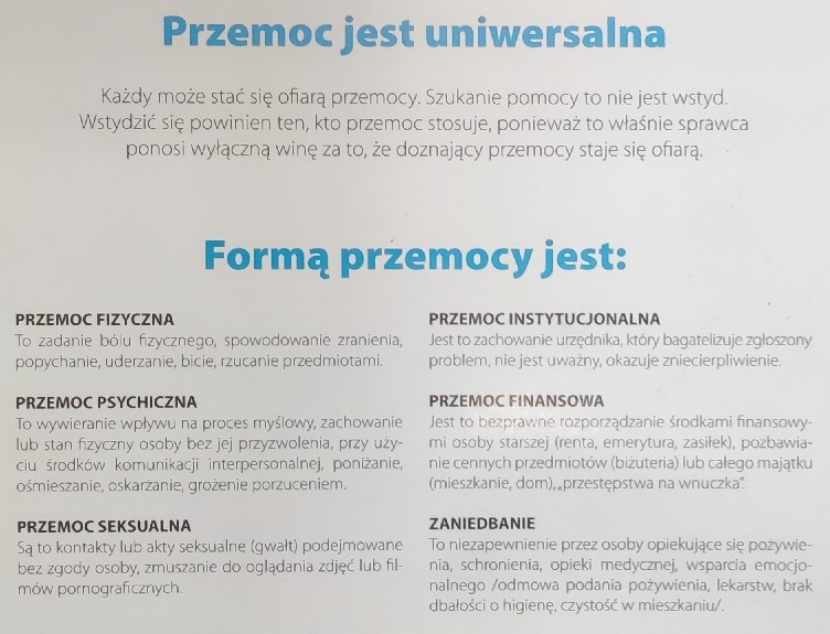 Tak jak są różni ludzie, tak też możemy mówić o różnych rodzajach przemocy – nie jest nią wyłącznie przemoc fizyczna i psychiczna, możemy tu bowiem wskazać przemoc seksualną, ekonomiczną, jak również przemoc poprzez zaniedbanie – czyli naruszenie obowiązku do opieki ze strony osób najbliższych. Należy przede wszystkim pamiętać, że przemoc bardzo często stanowi naruszenie prawa. Najczęściej popełnianymi i najbardziej dolegliwymi społecznie są przestępstwa przeciwko życiu i zdrowiu, przeciwko wolności, wolności seksualnej i obyczajności oraz przeciwko rodzinie i opiece.