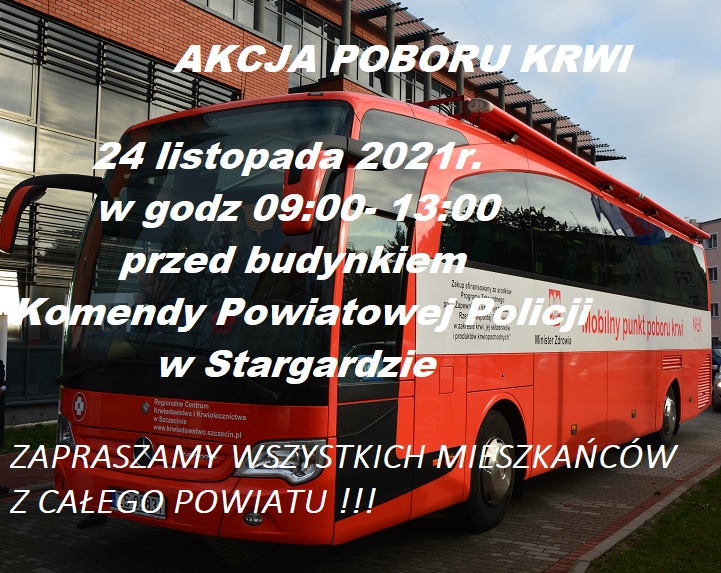 Zapraszamy wszystkich, którzy chcą nieść pomoc na kolejną akcję poboru krwi, która odbędzie się 24 listopada 2021r. w godz. 09:00- 13:00 przed budynkiem Komendy Powiatowej Policji w Stargardzie