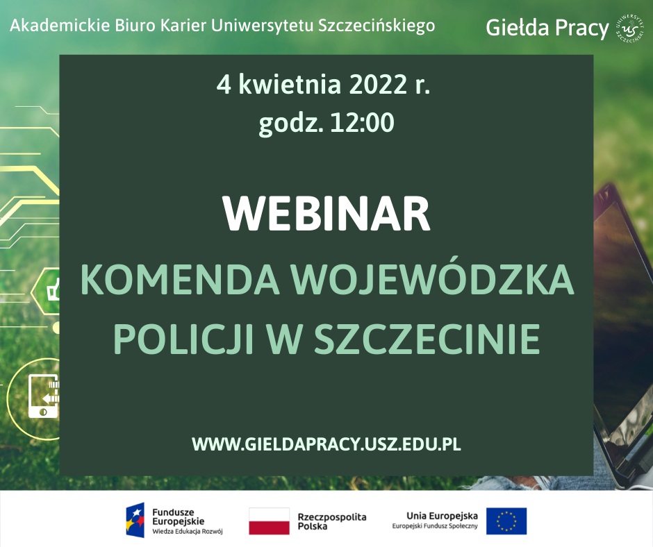 Policjanci Wydziału Kadr i Szkolenia KWP w Szczecinie, zapraszają na spotkanie online które odbędzie się w dniu 4 kwietnia 2022 r godz. 12:00 w ramach Giełdy Pracy organizowanej przez Akademickie Biuro Karier Uniwersytetu Szczecińskiego. Podczas webinaru będzie można uzyskać informacje na temat prowadzonego doboru do służby w Policji. Wśród wiadomości znajdą się m. in. jakie wymagania stawiane są kandydatom do służby w Policji czy jak przebiega procedura kwalifikacyjna oraz jakie możliwości daje służba w formacji jaką jest Policja.