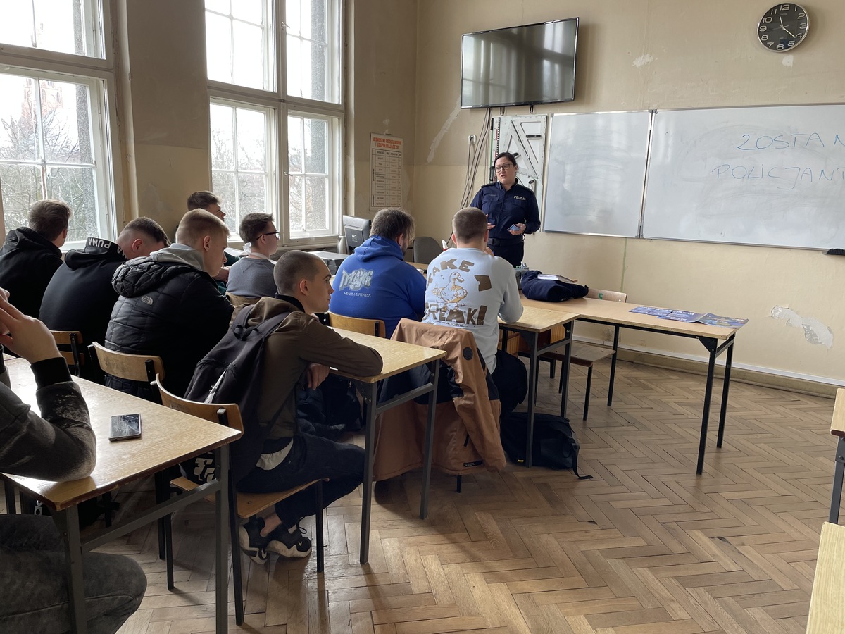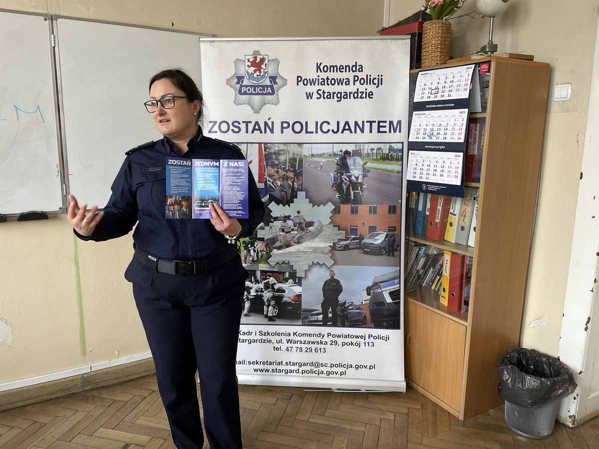 Wybierając swoją przyszłość, warto wiedzieć, że Policja oferuje szeroki wachlarz możliwości rozwoju, a także uzupełniania swojego wykształcenia na poziomie studiów różnego stopnia i w ramach szkoleń specjalistycznych. Podczas realizowanych spotkań z młodzieżą mundurowi przekazywali uczniom informację na temat etapów rekrutacji, wymagań jakie musi spełniać kandydat, a także terminach planowanych przyjęć do służby w bieżącym roku. Poszukujemy osób, które chcą nosić policyjny mundur i z pasją wykonywać powierzone zadania. Ruch drogowy, prewencja, technika kryminalistyczna, zwalczanie przestępczości gospodarczej, zespoły prasowe, laboratoria, przewodnicy psów, czy też policyjni antyterroryści. To służba wszechstronna i gotowa przyjąć w swoje szeregi osoby o różnym wykształceniu i zainteresowaniu.