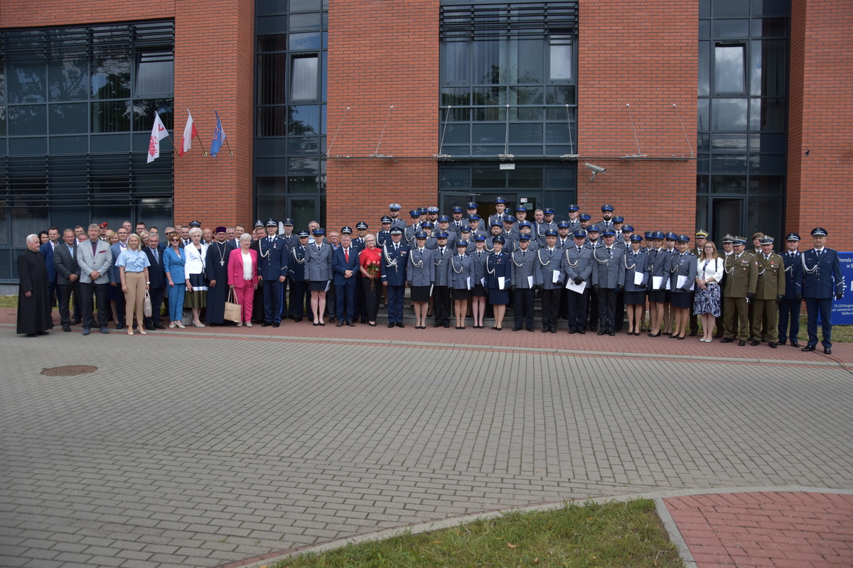 Na koniec uroczystości zaproszeni goście, policjantki, policjanci oraz pracownicy Policji stanęli do pamiątkowego zdjęcia.