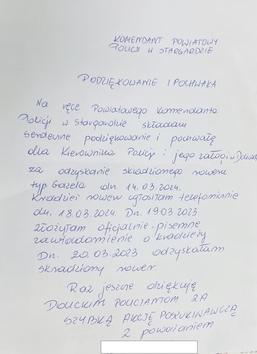 Do Komendanta Powiatowego Policji w Stargardzie wpłynęły podziękowania dla policjantów z Posterunku Policji w Dolicach. Szybkie i skuteczne działania policjantów przyczyniły się do odzyskania roweru, który został skradziony. Pokrzywdzona nie kryła swojej wdzięczności z pomyślnego rozwiązania jej sprawy.