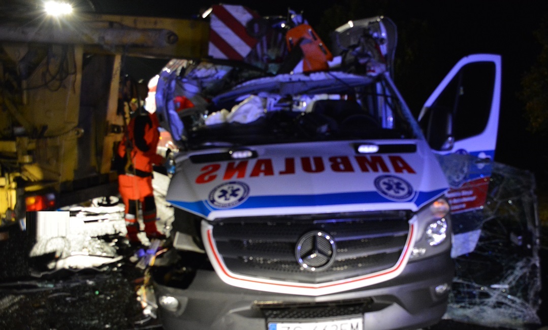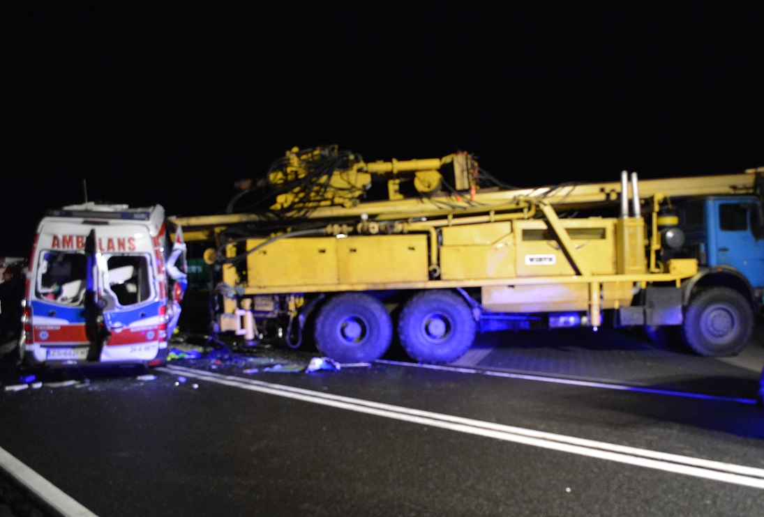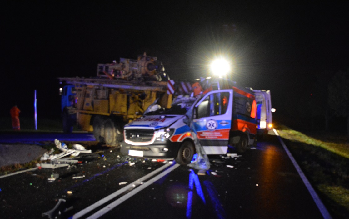 Transportująca chorego karetka pogotowia ratunkowego jadąc na sygnałach zderzyła się z unieruchomioną na drodze ciężarową wiertnicą, której kierowca na linii podwójnej ciągłej wykonywał niedozwolony manewr skrętu.