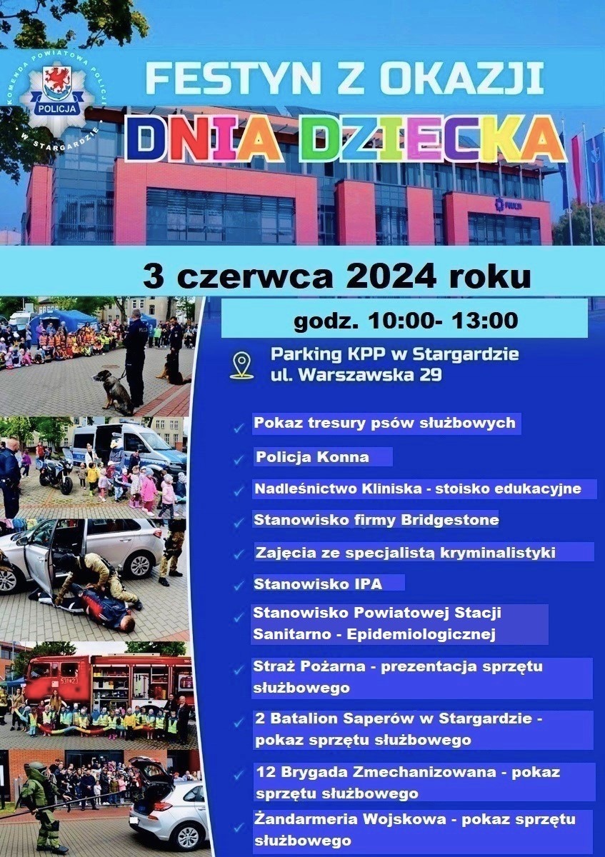 W poniedziałek 3 czerwca 2024 roku Komenda Powiatowa Policji w Stargardzie serdecznie zaprasza wszystkie dzieci na festyn z okazji Dnia Dziecka, który odbędzie się na placu przed komendą na ul. Warszawskiej 29 w godzinach 10-13.