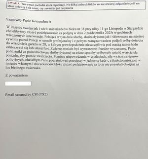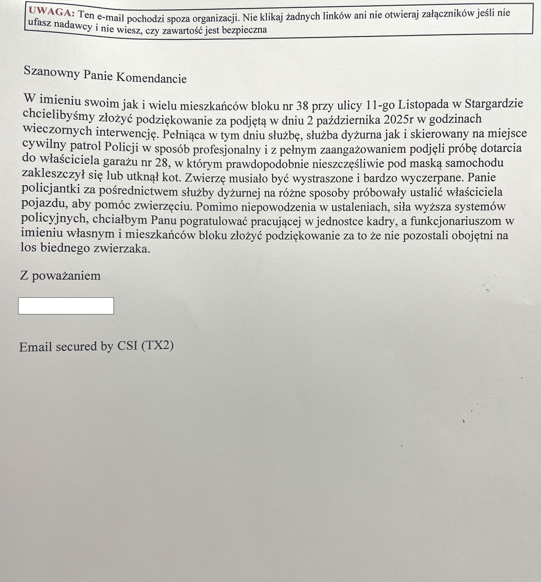 Do Komendy Powiatowej Policji w Stargardzie wpłynęły podziękowania dla funkcjonariuszy od mieszkańców naszego miasta. Autor podziękowań w imieniu swoim oraz sąsiadów, wyraził wdzięczność funkcjonariuszkom, które w dniu 2 października 2025 roku podjęły wieczorną interwencję w sprawie zwierzęcia znajdującego się w niebezpieczeństwie. Pogratulował Komendantowi Powiatowemu Policji w Stargardzie pracującej w jednostce kadry, a samym policjantom podziękował za to, że nie pozostali obojętnymi na los biednego zwierzaka.