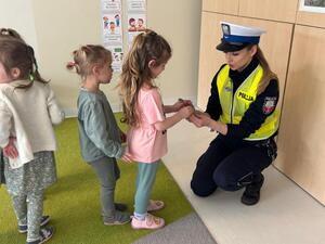 Podczas spotkania funkcjonariuszki omówiły z przedszkolakami zasady bezpiecznego poruszania się po drodze. Dzieci dowiedziały się, jak prawidłowo przechodzić przez jezdnię, dlaczego należy korzystać z przejść dla pieszych oraz jak ważne jest noszenie elementów odblaskowych, szczególnie po zmroku. Policjantki przypomniały również najmłodszym znaczenie sygnalizacji świetlnej i konieczność zachowania ostrożności w pobliżu ulic.