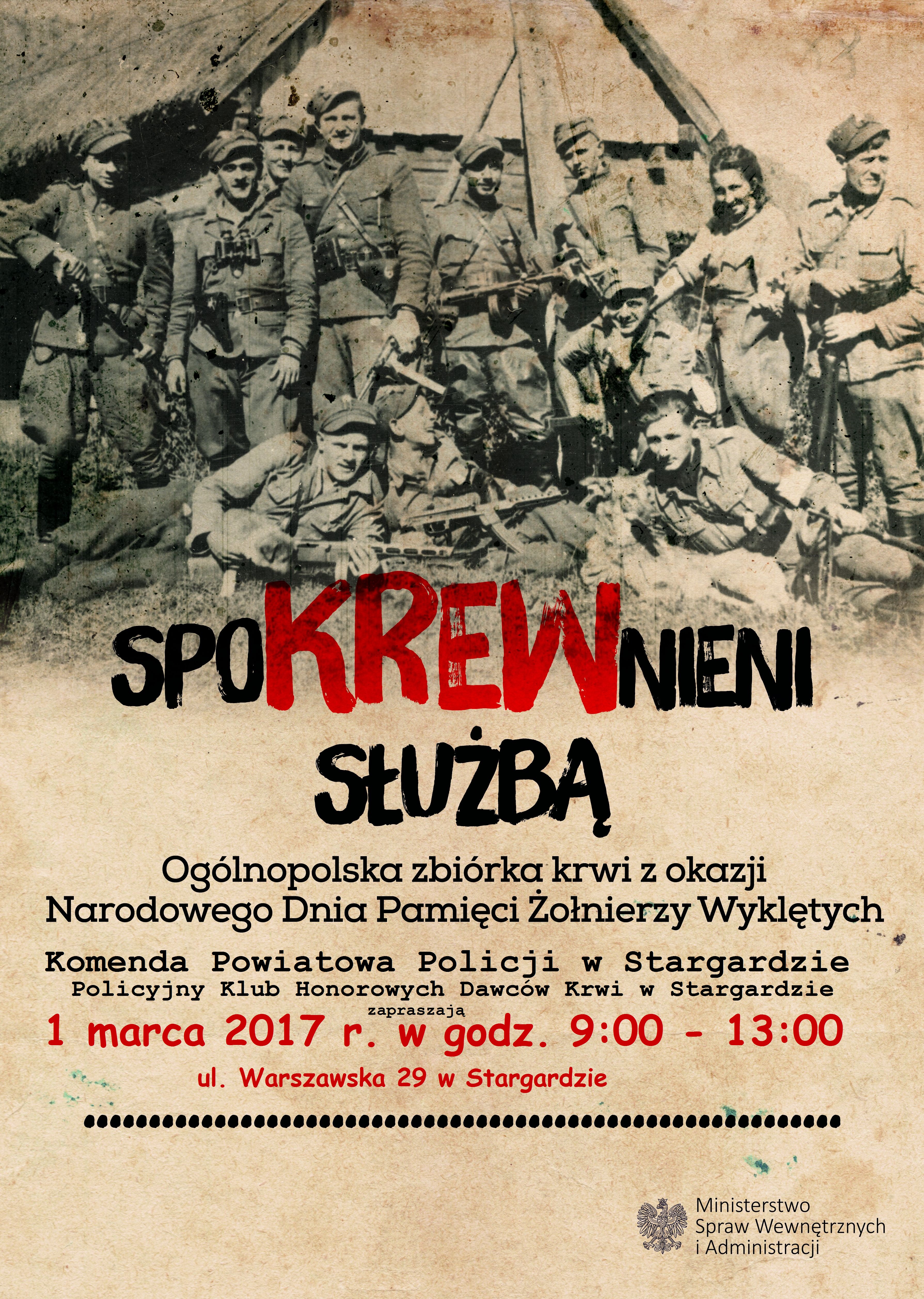 Dla uczczenia Narodowego Dnia Pamięci Żołnierzy Wyklętych dzisiaj na terenie województwa zachodniopomorskiego, a tym samym na terenie Stargardu zainaugurowana została ogólnopolska akcja honorowego krwiodawstwa pod patronatem Ministra Spraw Wewnętrznych i Administracji pod hasłem „„spoKREWnieni służbą".