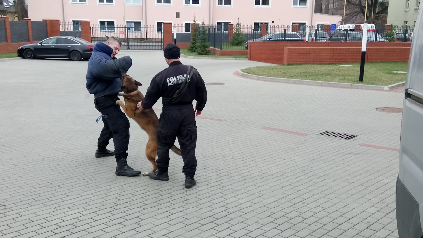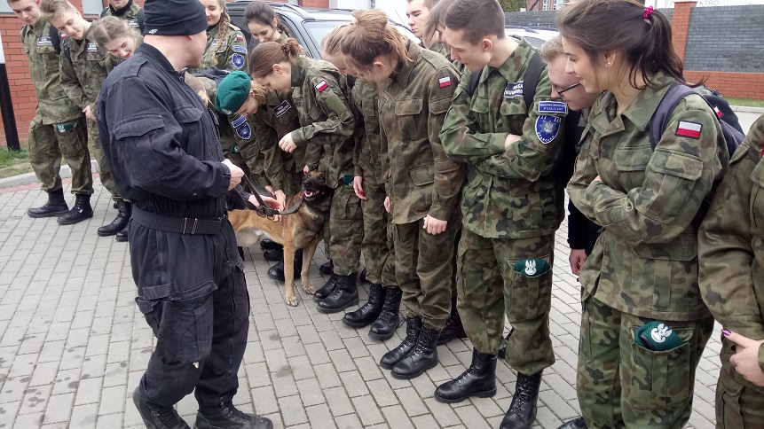 Natomiast tym razem uczniowie spotkali się z przewodnikami psów służbowych i ich czworonogami. Podczas wizyty nastolatkowie między innymi dowiedzieli się, w jaki sposób trafiają psy do służby, jakie rasy są preferowane i jakie zadania stawiane są na co dzień przed czworonogami. Ponadto policjanci pokazali słuchaczom, gdzie psy przebywają w godzinach wolnych od pracy i przedstawili jeden z etapów szkolenia, jakim jest zatrzymanie niebezpiecznego przestępcy.